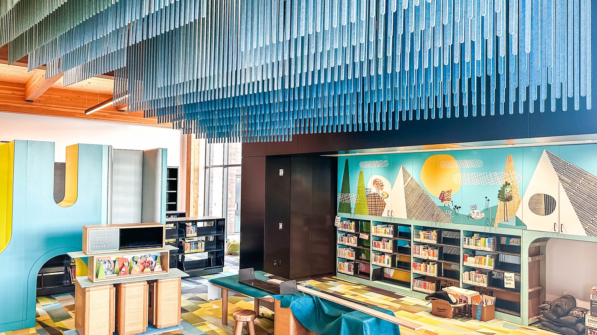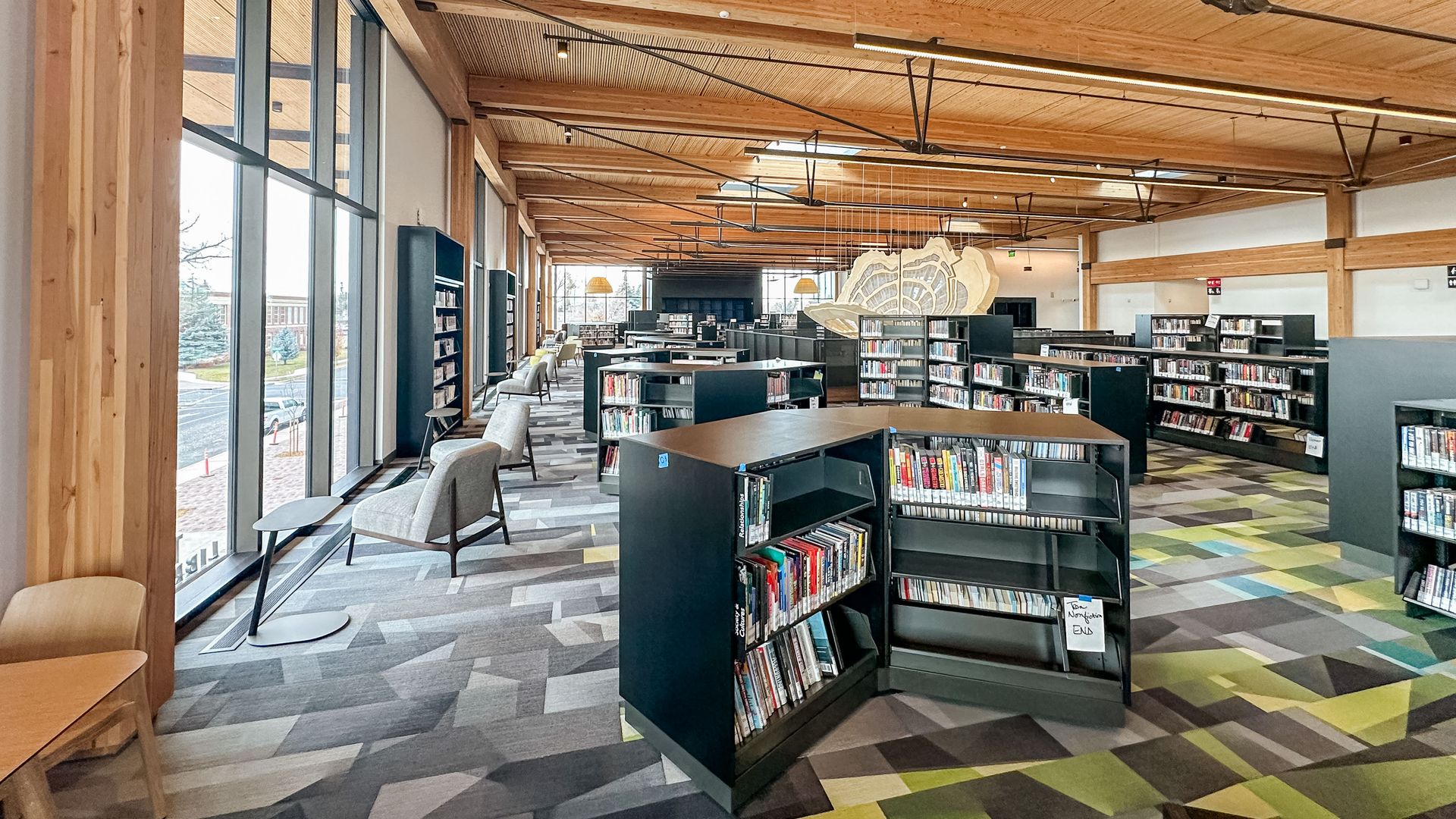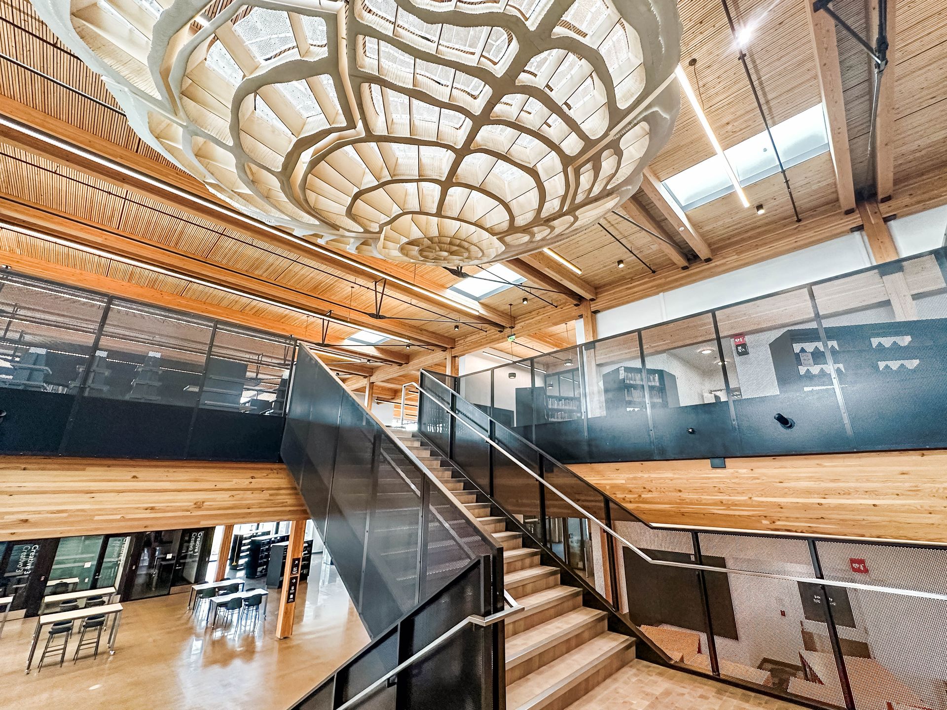 Large and divisible meeting spaces are available to the community during the day and for after-hour meetings/gatherings, and highly functional spaces provide opportunities for creative, hands-on activities and programs for all ages. Adjoining smaller rooms are available for recording, filming, and collaborating. On the second level, adults and teens enjoy a collaborative/co-working area, tutor rooms, a dedicated teen space, ample seating and technology access throughout, as well as natural light beaming through large windows and skylights. The second floor also holds the majority of the materials collection.