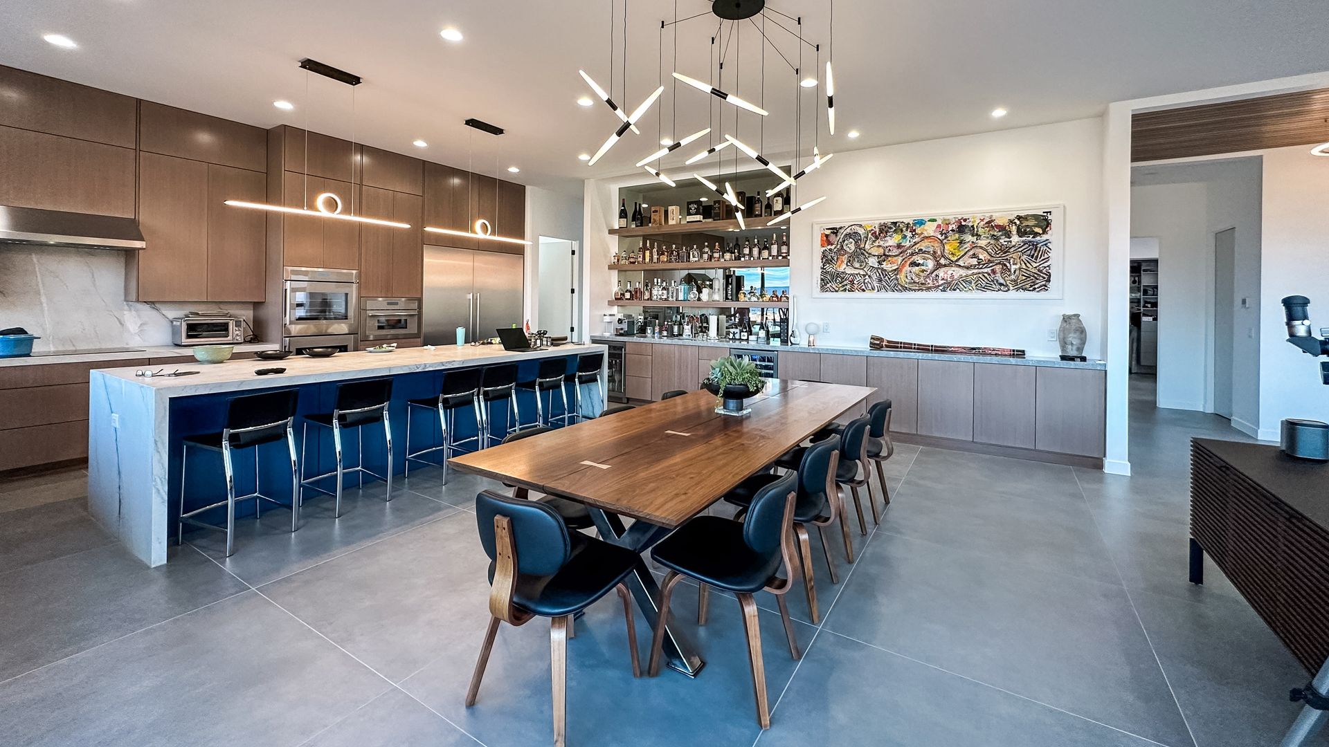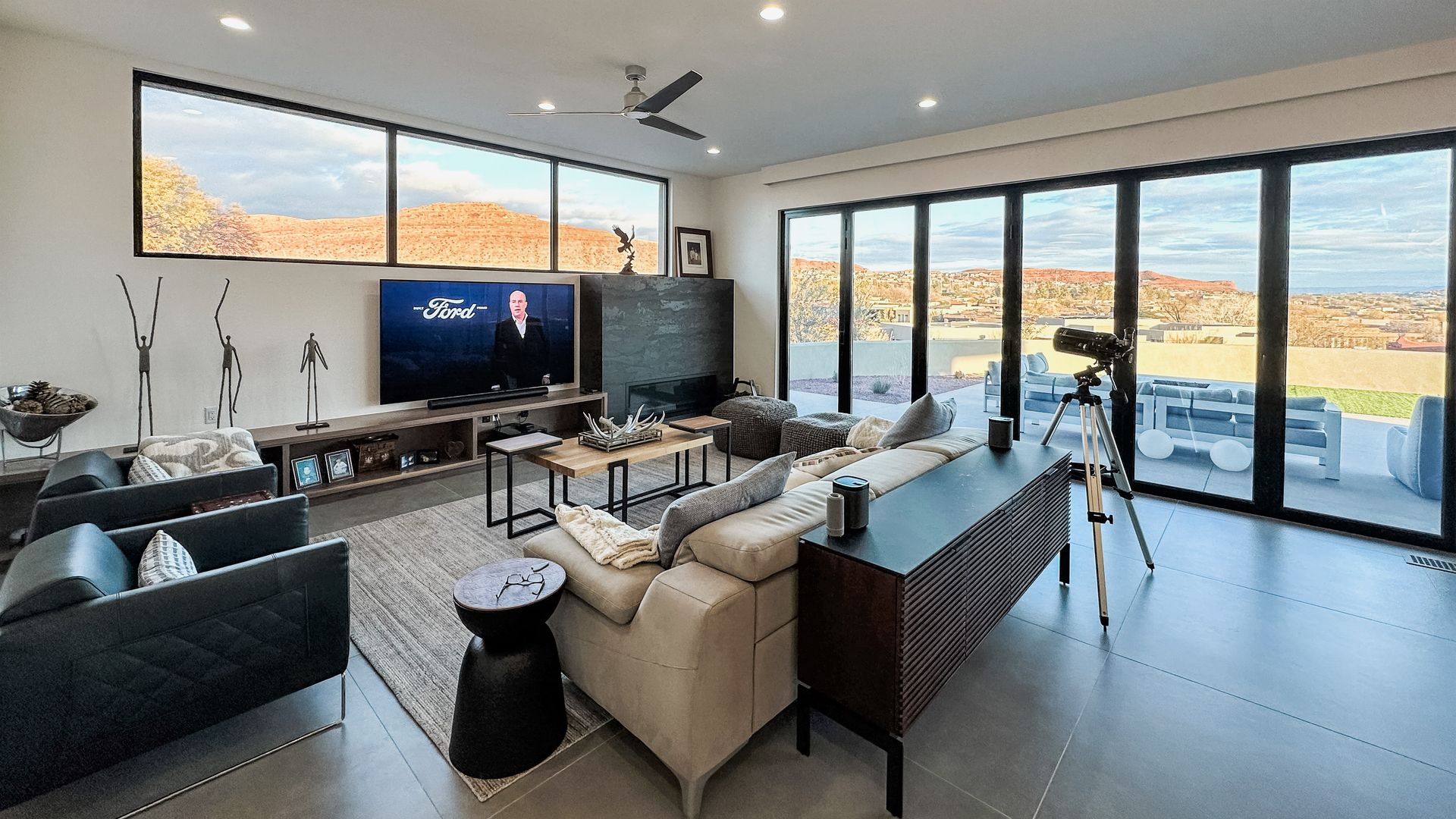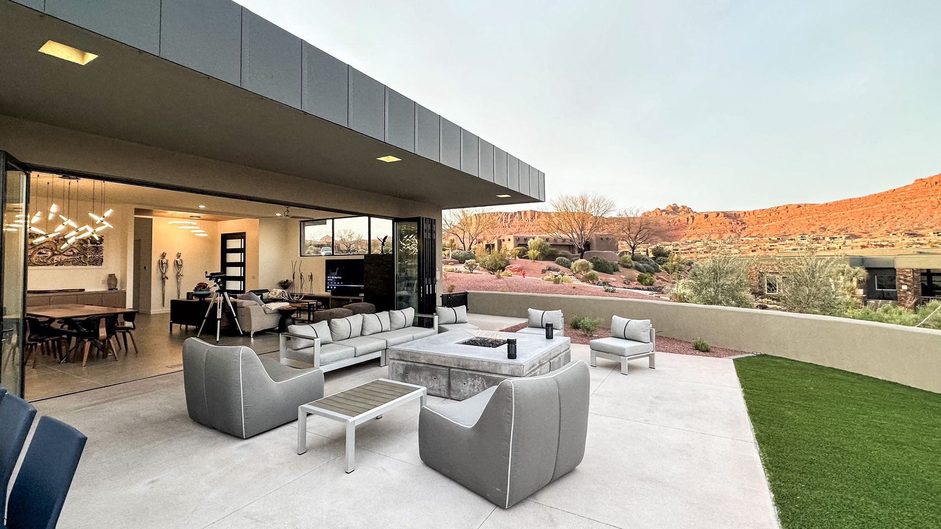 STEELE responded with a beautiful design that captures over 300-degree views from three sides of the home. The interior flows seamlessly to the exterior through a 9’ x 24’ operable glass wall that links the great room to the large patio whose edge is a gentle asymmetrical curve which follows the natural contours of the site. The views of red sandstone cliffs of Paradise Rim, the plateaus to the south in Arizona, and West Butte are stunning. The main bedroom and casita bedroom also have large sliding openings to the exterior.